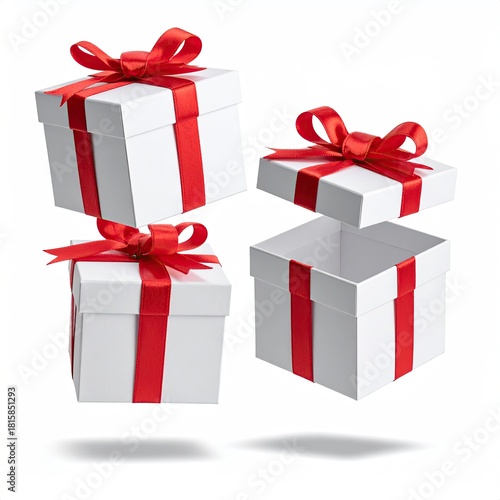 Fototapeta premium Three white gift boxes with red ribbons, one open