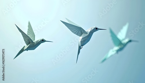 © Joy, Obraz premium Three white hummingbirds in flight against a light blue sky