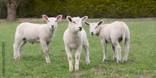 © erwin, Fototapeta premium Three white lambs in the prairie in Spring