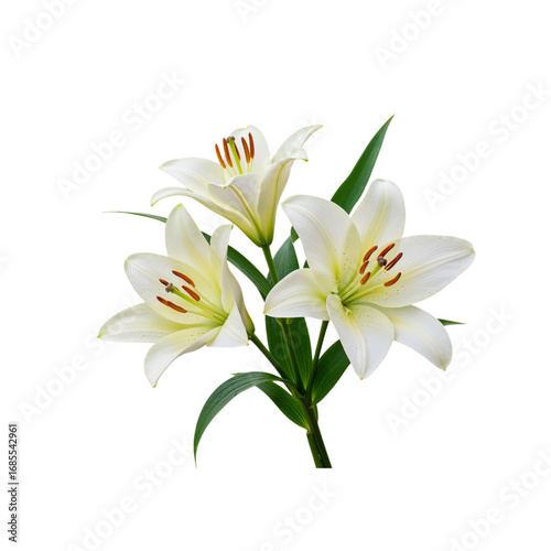 © Creative Vector, Fototapeta premium Three white lilies blooming with green stems and leaves isolated on a black background transparent background