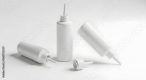 © Ilham, Fototapeta premium Three White Plastic Bottles with Dispensing Tips on White Background