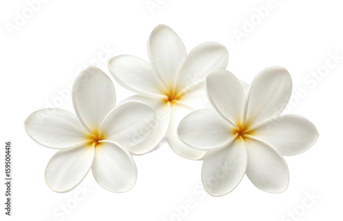 Fototapeta premium Three white plumeria flowers with yellow centers on black