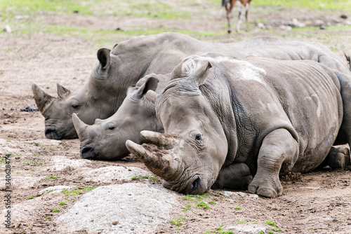 © Carlos Aranguiz, Fototapeta premium Three white rhinos lying on the ground.