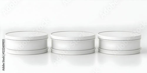 © Siasart, Obraz premium Three White Round Storage Containers with Lids on a White Background
