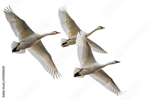 © Big, Fototapeta premium Three white swans flying in the sky with their wings spread, isolated on a transparent background