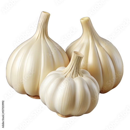 Obraz premium Three whole garlic bulbs with stems isolated on transparent background