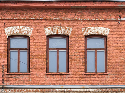 Fototapeta premium Three windows of the old mansion 19 century with brown bricks wall