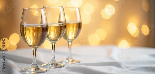 © Vadym, Obraz premium Three wine glasses filled with white wine stand on a white tablecloth. Soft golden bokeh lights create a festive atmosphere, perfect for celebrations and gatherings.