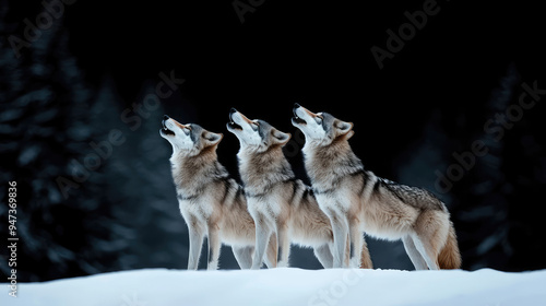 © Oranuch, Naklejka premium Three wolves howl together beneath a starry sky, embodying the spirit of the wild in a serene winter landscape.