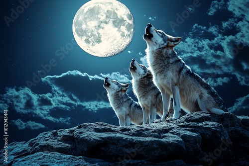 Naklejka premium Three wolves howling at a full moon in a night sky, set against a rocky...