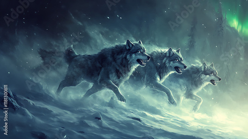 © Hairoman Hairoman, Obraz premium Three wolves running through a snowy landscape under the aurora borealis.