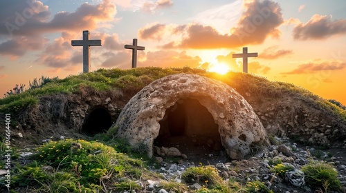 Fototapeta premium Three women find empty tomb and crosses at sunrise, symbolizing easter and...