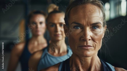 Obraz premium Three Women in Gym Attire Focused Expression Studio Setting.