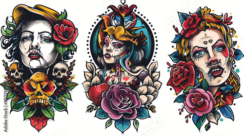 © whitecityrecords, Obraz premium Three women with tattoos and skulls on their faces. The first woman has a skull on her head and a rose on her face