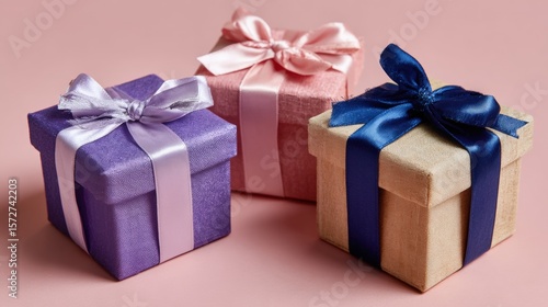 © Nikolai, Fototapeta premium Three wrapped gift boxes with colorful ribbons and bows on a solid pink background, studio lighting.