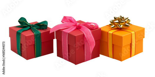 © jahanarabegum7973, Obraz premium Three Wrapped Gift Boxes with Ribbons present isolated on a transparent background