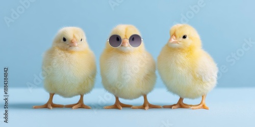 Fototapeta premium Three yellow chicks, wearing sunglasses, on blue