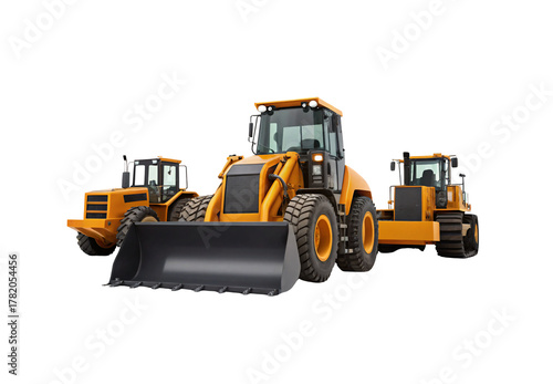 Fototapeta premium Three yellow construction vehicles including wheel loader and bulldozers with black accents, isolated on a transparent background
