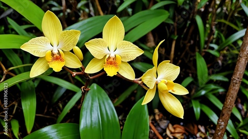 © Image or video art, Obraz premium Three yellow orchids in bloom with green leaves in the background.