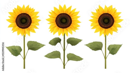© Santai, Obraz premium Three yellow sunflowers with brown centers and green leaves on a white background