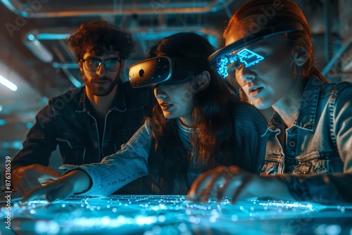Fototapeta premium Three young adults collaborate on a project using VR technology, their expressions focused and engaged.