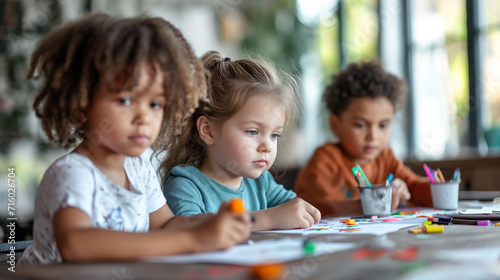 © T-elle, Fototapeta premium Three young children deeply focused on coloring with markers at a table, showcasing diversity and early childhood education
