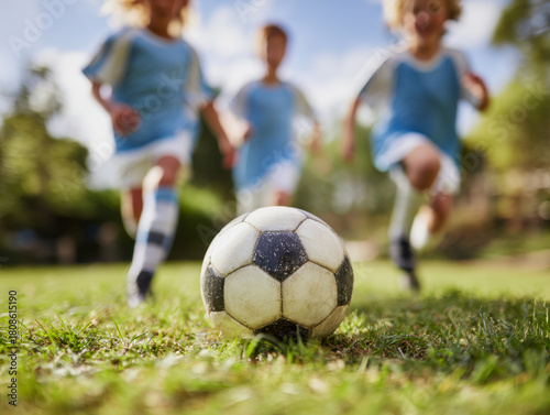 © Mikhail Vorobev, Fototapeta premium Three young children in sportswear running towards a soccer ball on grassy field during a bright sunny day in an outdoor park setting