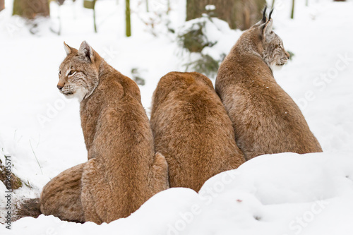 © Jürgen Bochynek, Naklejka premium Three young Eurasian bobcats Lynx lynx sitting side-by-side in snow-covered winter landscape
