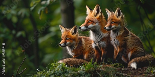 © TheWaterMeloonProjec, Naklejka premium Three young foxes keeping an eye on their mother