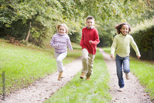 Fototapeta premium Three young friends running on a path outdoors smiling