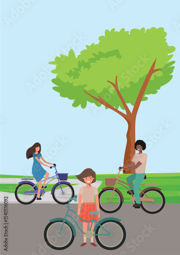© Fazarrenjana, Naklejka premium Three Young girls riding bicycles in street