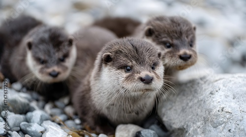 Obraz premium Three young otters resting on a pebble strewn riverbank