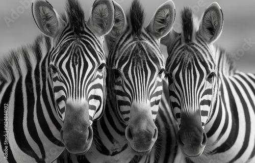 © mehroo, Fototapeta premium Three zebras in the savanna, a close-up shot of their heads and necks,
