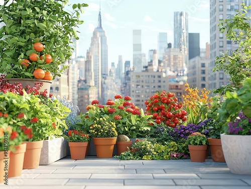 Fototapeta premium Thriving rooftop garden in urban setting with bright, vibrant colors and a bustling cityscape in the background