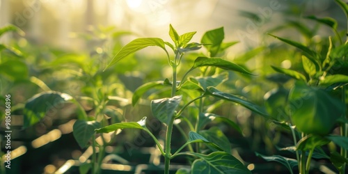 © TheWaterMeloonProjec, Obraz premium Thriving young green pepper plants in a controlled environment.