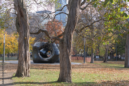 Fototapeta premium through the trees view of Henry Moore's Large Two Forms, western edge of Grange Park, Toronto