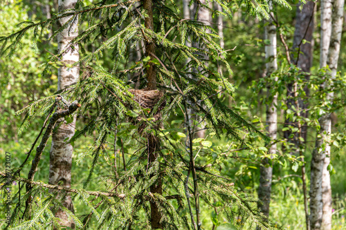 Fototapeta premium thrush nest on spruce in the forest. Birds of Russia forests.