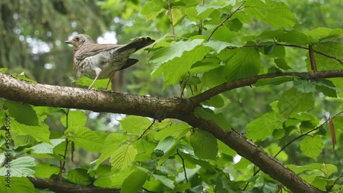 Fototapeta premium Thrush sitting on a branch in the forest.