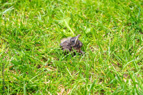 © Ordasi Tatyjana, Obraz premium Thrush young bird in the green grass at spring. Thrush baby bird fell from its nest.