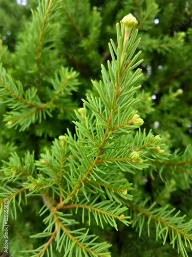© Timothy, Fototapeta premium Thuja occidentalis close-up. Green thuja tree branches, background.