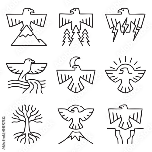 Fototapeta premium Thunderbird Nature Elements Icon Set – Black and White Vector Line Art