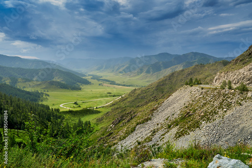 Fototapeta premium thunderclouds on a mountain pass. view from the mountain pass to the winding...
