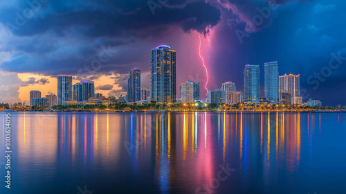 Fototapeta premium Thunderstorm Illuminating the Night Skyline