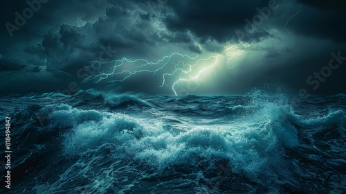 Naklejka premium Thunderstorm over ocean, lightning illuminates churning waves in dramatic contrast