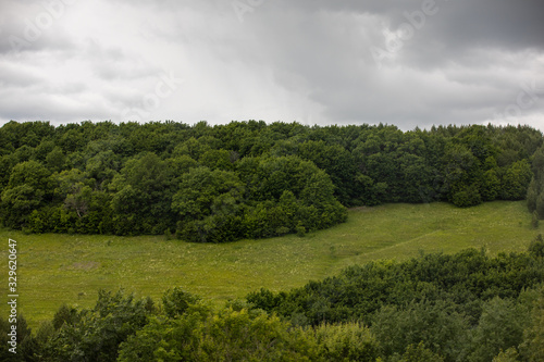 © ILYA, Fototapeta premium thunderstorm sky landscape with green hill and tree forest
