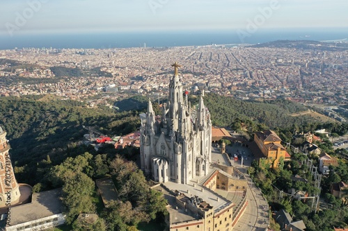 © Frederique, Fototapeta premium Tibidabo, Barcelona, Espagne, Parc d'attraction, Eglise, Christ vue par Drone