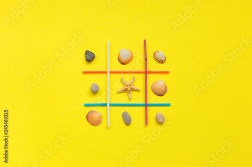 Fototapeta premium Tic-tac-toe. Choice Competition Game Between seashell and sea stone on yellow...