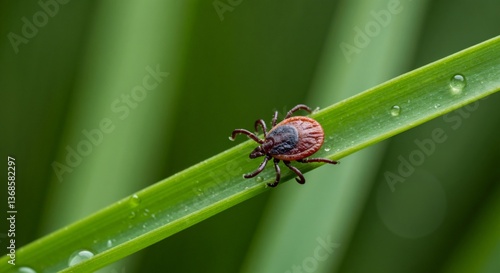 Fototapeta premium Tick crawling on a green leaf surrounded by droplets