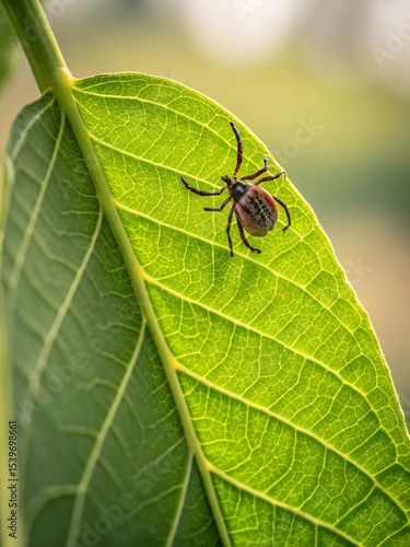 © Andrew , Fototapeta premium Tick on a leaf in spring, close-up on a green leaf