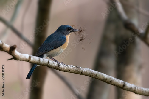 Obraz premium Tickle's Blue Flycatcher perched carrying nesting material